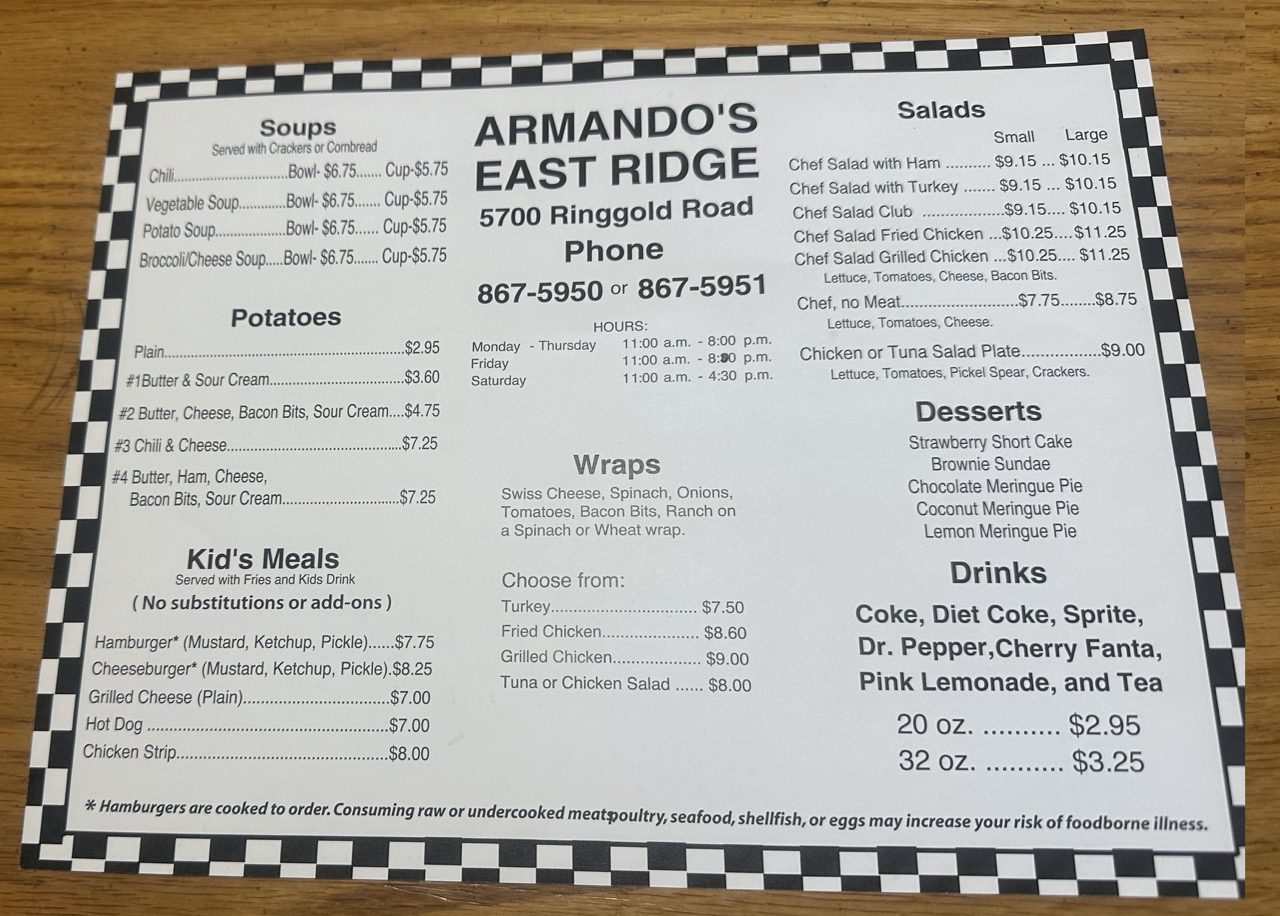 Armando’s East Ridge is a Classic American diner in East Ridge, TN. For over 30 years, we have served staples of American cuisine like our famous hamburger and french fries. Our menu also includes a variety of other sandwiches, salads, soups, and delicious desserts.